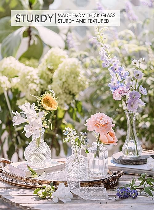 【Thickened & Half-Transparent Color Glass】–These small flower vases are made of thick and strong glass, thick bottle wall and thickened bottom design make the glass bud veses more durable and not easily broken. The patterned surface treatment and transparent glass color makes them look very textured and makes them shine under the light. You may see the beauty of individual stems of flowers and garden cuttings vividly from the glass vase.